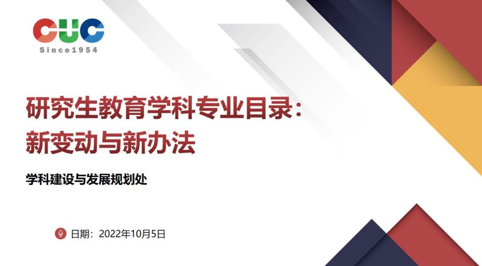 (通讯员 徐雯)近日,国务院学位委员会、教育部印发了《研究生教育学科专业目录(2022年)》(以下简称新版目录)和《研究生教育学科专业目录管理办法》(以下简称管理办法)。作为十年来的新一轮目录修订,新版目录对我国研究生学科专业的高水平建设和高等教育的高质量发展具有重大意义。为深入理解新版目录的指导精神,全面学习新版目录与管理办法的变动情况,10月5日下午,学科建设与发展规划处组织开展学习活动,邀请清华大学研究生教育研究中心副主任王传毅分享对新版学科专业目录变化及其管理办法的学习体会。