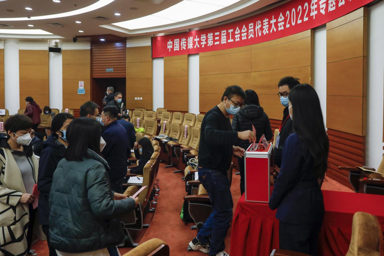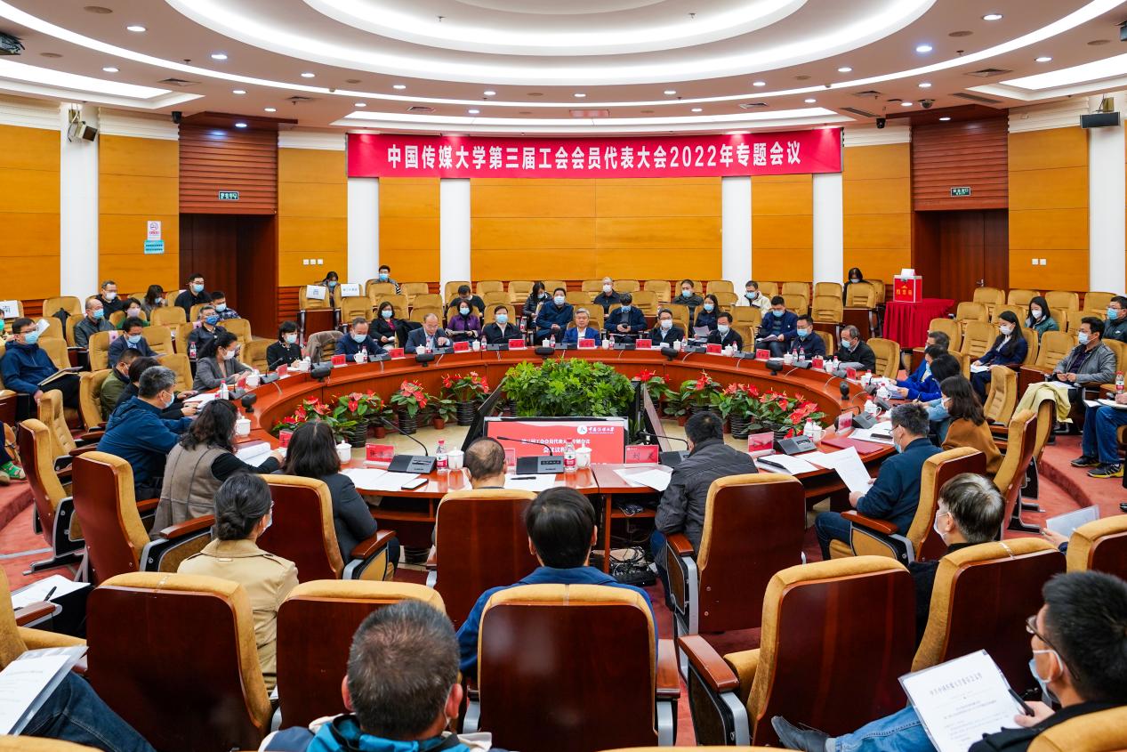 (通讯员 杨浦 摄影 王雷亭)10月27日上午,中国传媒大学第三届工会会员代表大会2022年专题会议在我校图书馆圆形报告厅召开。中国传媒大学党委书记廖祥忠,校长、党委副书记张树庭,党委副书记、纪委书记王达品,党委副书记李众,副校长刘守训、李新军、段鹏、王晖,党委常委、组织部长徐红梅,校长助理王志和我校工会会员代表共计73人出席会议,会议由副校长兼工会主席刘守训主持。