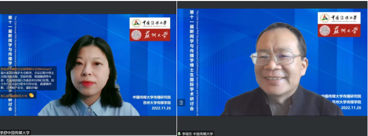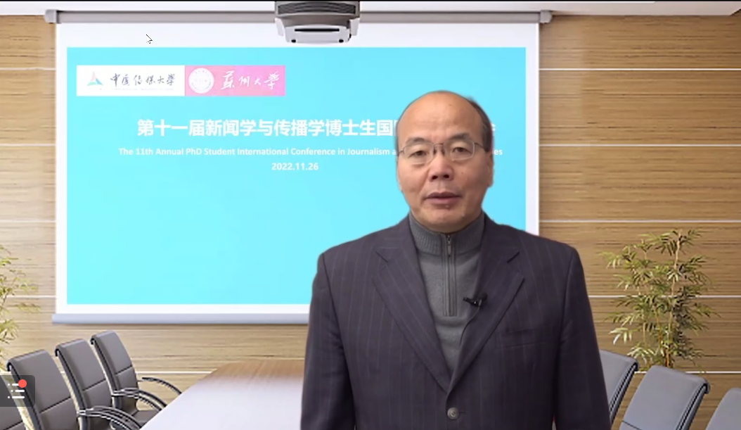 (通讯员 王晓丹)2022年11月26日,第十一届“新闻学与传播学博士生国际学术研讨会”在北京和苏州线上线下同步举行,共有来自42所高校70名师生参加。本次研讨会由中国传媒大学和苏州大学联合举办,中国传媒大学传播研究院和苏州大学传媒学院联合承办。中国传媒大学副校长刘守训教授出席了开幕式并致辞,开幕式由中国传媒大学传播研究院副院长李继东教授主持。