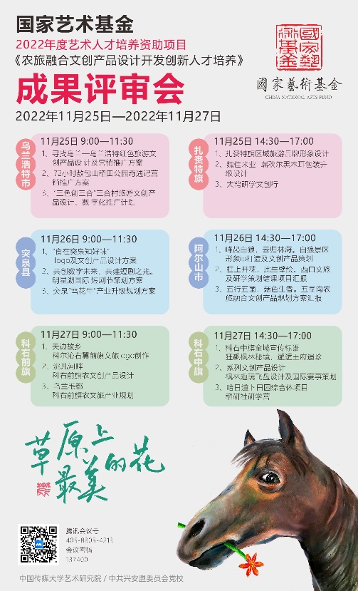 (通讯员 张郁纷)11月25日至27日,由我校主办的2022年度国家艺术基金艺术人才培养资助项目《农旅融合文创产品设计开发创新人才培养》成果评审会在线上举行。《农旅融合文创产品设计开发创新人才培养》项目由中国传媒大学、兴安盟委党校联合申报实施,是我校与兴安盟开展盟校合作以来的重要成果。