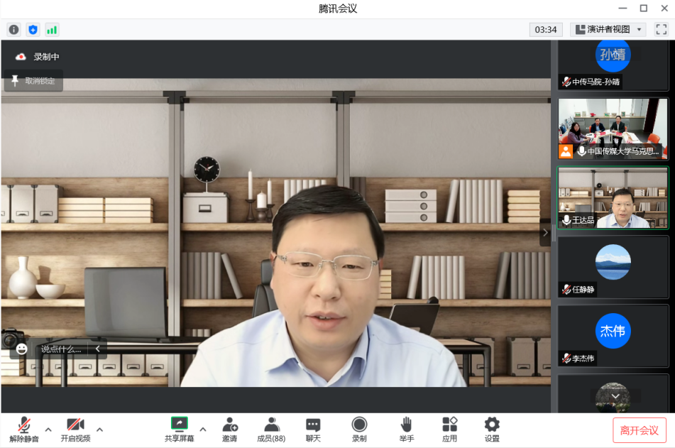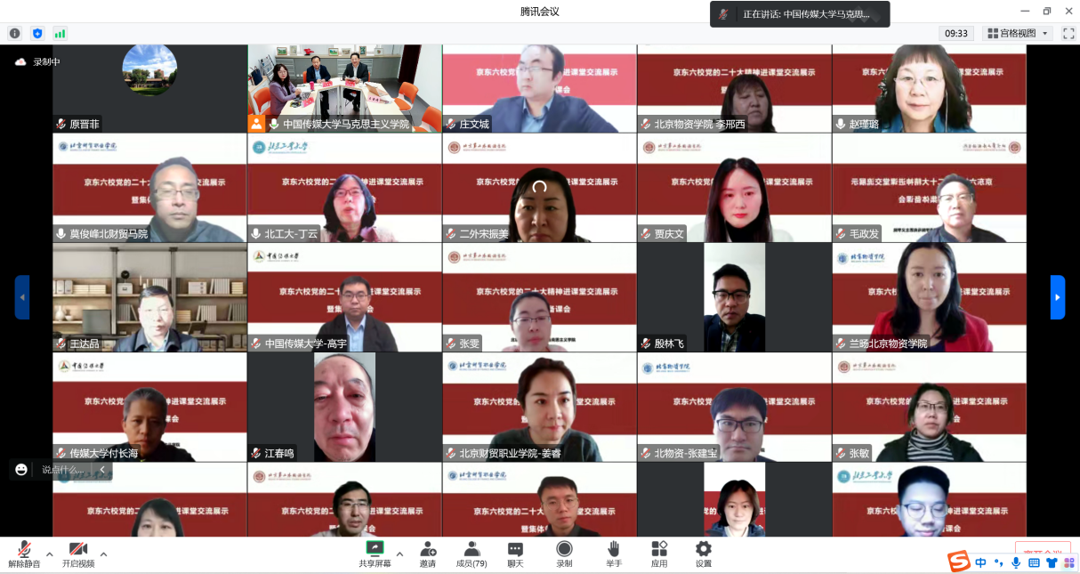 (通讯员 孙靖)为深入学习领会党的二十大精神,将党的二十大精神更好融入思政课教学,12月4日上午,中国传媒大学马克思主义学院与北京工业大学、北京第二外国语学院、北京物资学院、北京财贸职业学院和北京工商大学嘉华学院等五所高校的马克思主义学院共同主办了“京东六校党的二十大精神进课堂交流展示暨集体备课会”,中国传媒大学党委副书记、纪委书记王达品出席并作总结点评。交流展示会由中国传媒大学马克思主义学院院长刘东建教授主持。六校马院全体专兼职思政课教师线上观摩了教学展示,共同完成了此次六校思政课教师集体备课。