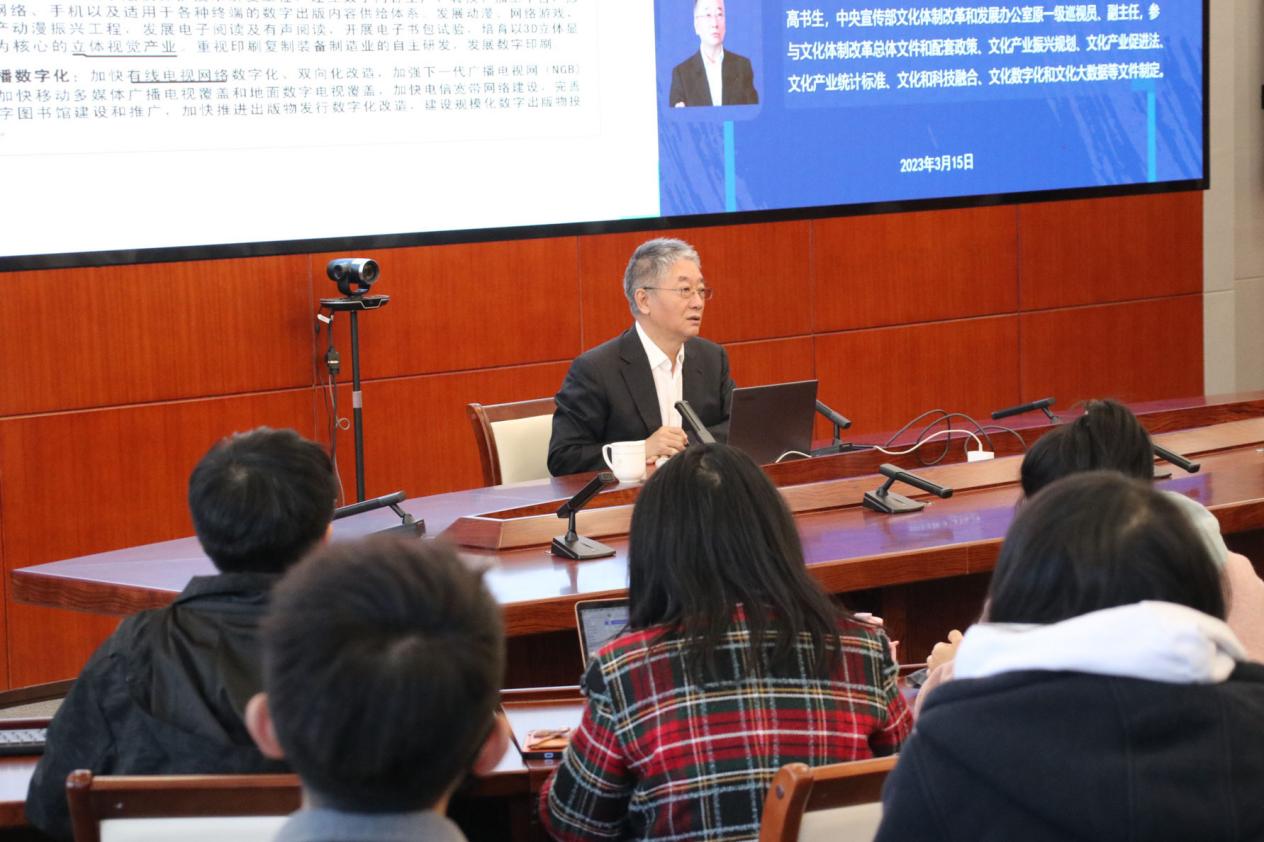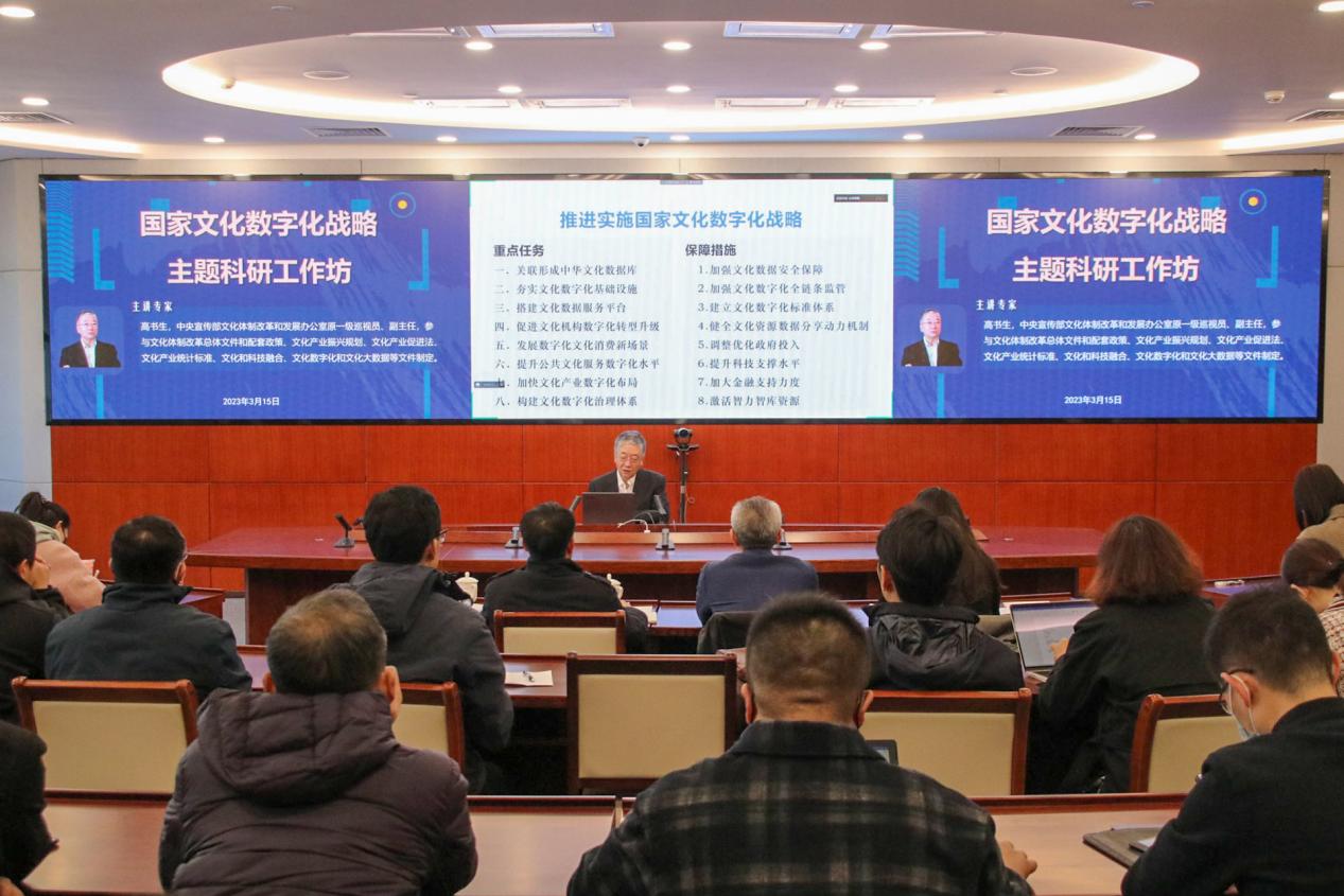 (通讯员 高鹏 王钰)为深入落实中共中央办公厅、国务院办公厅印发的《关于推进实施国家文化数字化战略意见》,积极服务国家文化数字化战略实施,继续做好有组织科研服务,2023年3月15日,由科学研究处举办的国家文化数字化战略主题科研工作坊在中传学术中心举行。中央宣传部文化体制改革和发展办公室原一级巡视员、副主任高书生作为主讲专家出席此次工作坊。工作坊由科学研究处处长周建新主持,文化数字化战略服务支持专项人员、科研机构、相关部门及教学科研单位人员到场学习。
