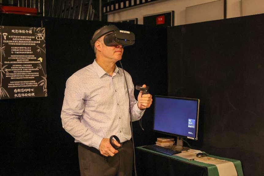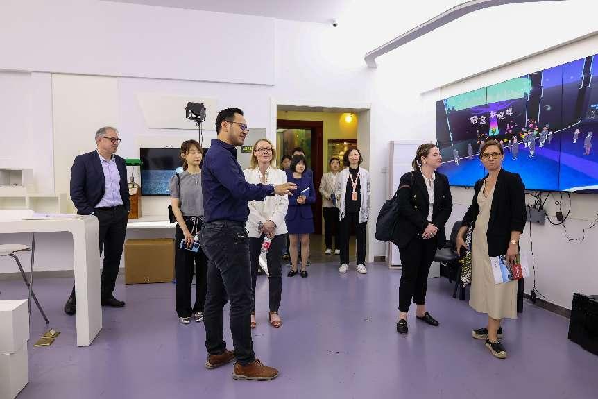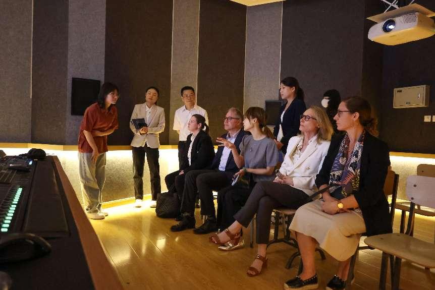 随后,代表团分别访问了我校音乐与录音艺术学院、动画与数字艺术学院、戏剧影视学院。赵志安带领代表团参观了学生日常学习的录音棚,放映了我校“E音之夜”多媒体原创电子音乐作品音乐会的影像,展示了我校学生将音乐与科技融合的原创音乐作品;陈京炜向代表团介绍了学院的发展历程、创新实践和国际大赛中获奖的主要作品,并带领代表团参观了“亚洲动漫研究中心”,欣赏了动画学院师生创作的作品集锦;戏剧影视学院副院长付龙在中传小礼堂向代表团介绍了学院正在进行的2019级影视摄影与制作(虚拟影像制作方向)毕业设计展《启窗而观》,代表团成员现场用VR眼镜身临其境体验了学生的作品,并与现场学生合影留念。