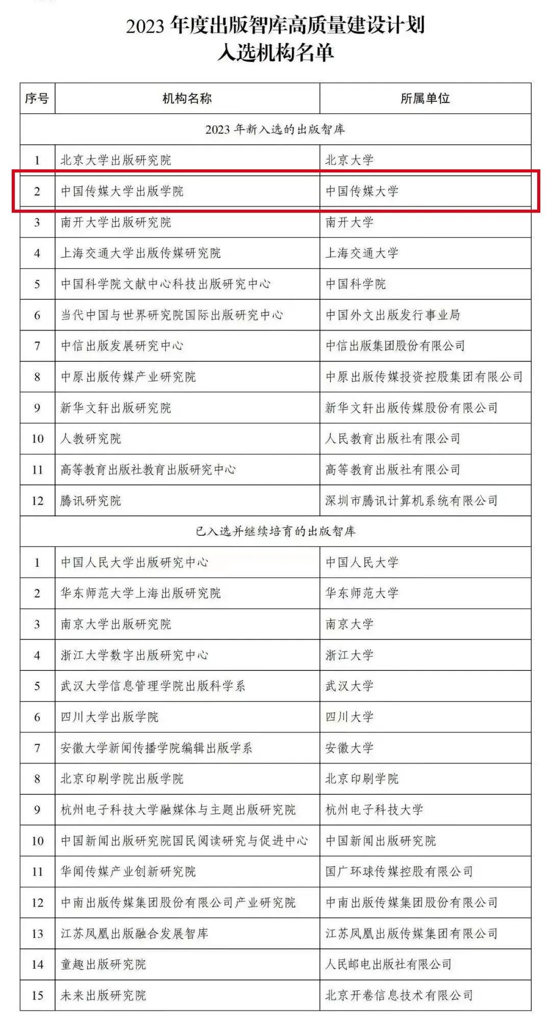 7月21日,国家新闻出版署发布2023年度出版智库高质量建设计划入选机构名单,中国传媒大学出版学院等27家机构入选。