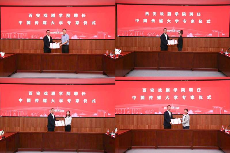座谈会上举行了西安戏剧学院聘任中国传媒大学专家仪式。刘正利宣读《西安戏剧学院关于聘用中国传媒大学兼职教师的决定》,姜浩扬为我校受聘专家代表关玲、张歌东、朱星辰、郝君怡、夏丽丽颁发聘书。