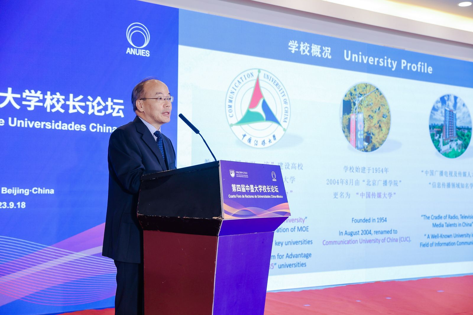(通讯员 杨君丽)9月18日,第四届中墨大学校长论坛在北京举行。中国教育国际交流协会会长刘利民、墨西哥公共教育部副部长孔切罗、中国驻墨西哥特命全权大使张润、墨西哥驻华大使施雅德、全墨高等教育协会秘书长冈萨雷斯、中国教育部高等教育司副司长武世兴、国际合作与交流司副司长陈大立出席论坛并致辞。中国传媒大学副校长刘守训应邀出席论坛,国际交流与合作处处长钟丹丹、外国语言文化学院西班牙语教授张晴等随同参会。