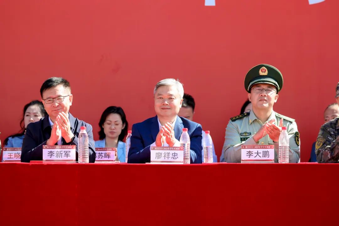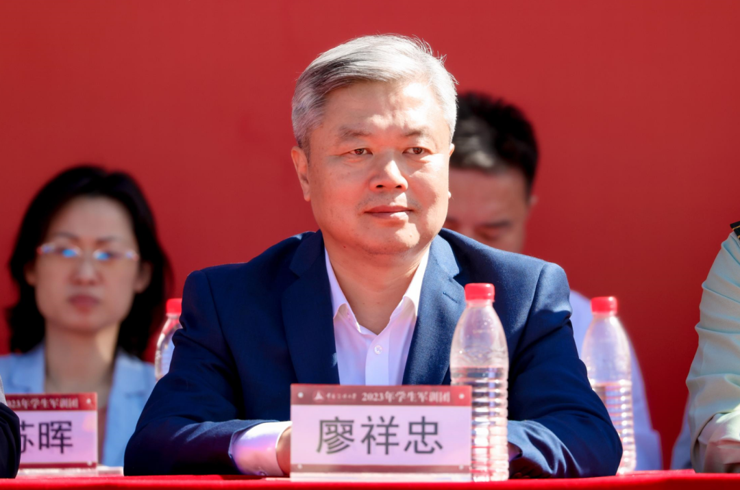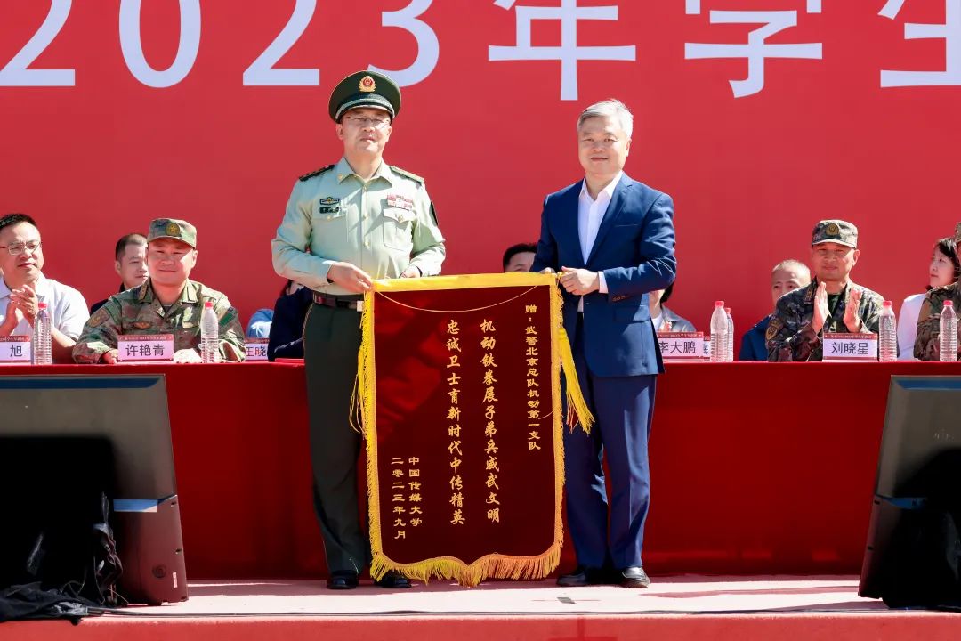 军事技能训练的圆满完成离不开军训基地和承训部队的全力保障支持,廖祥忠向军训基地和承训部队赠送锦旗。