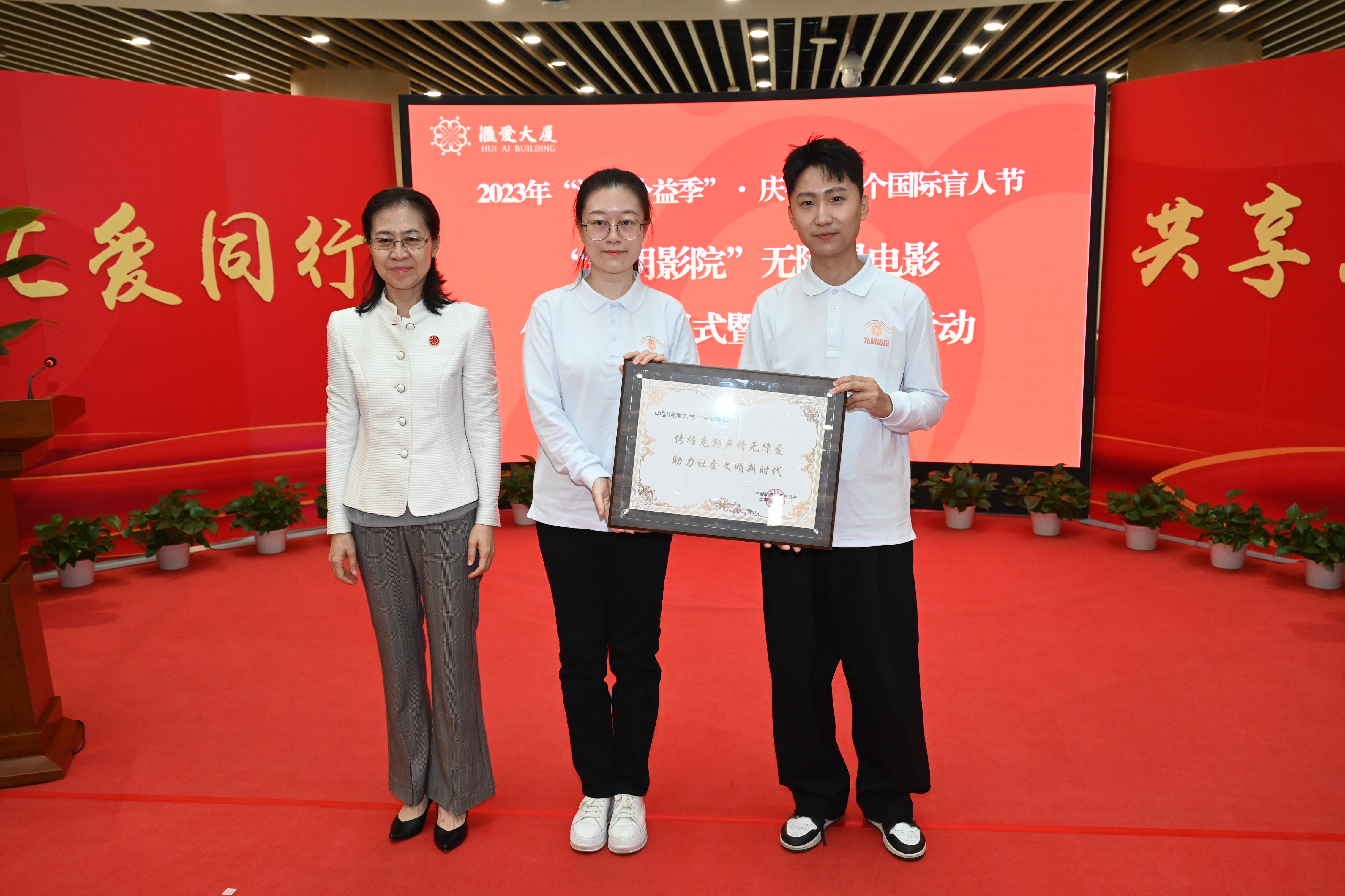 授予中国传媒大学荣誉牌匾和汇爱公益证书