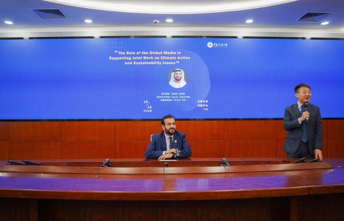 会谈结束后,默罕默德·杰拉勒·拉伊斯以“全球媒体在推动气候和可持续发展合作方面的作用”为主题进行讲座,并回答了同学们的提问。他指出,我们所处的世界正处于不断变化之中,全球气候变化是目前最重要的议题之一,公众也对其越来越重视。媒体能够号召全球民众共同面对这一难题,携手共建和谐、绿色的地球。会议由我校国家传播创新研究中心副主任张磊主持,来自我校国际传播白杨班和国际新闻传播硕士班的近50位学生参加了此次讲座。