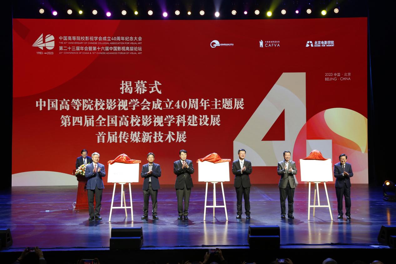在纪念大会上,与会领导为学会13位在会30年以上、新世纪以来仍多次参加学会活动的老会员、老理事颁发了终身荣誉会员证书,为22届年会的历届承办方颁发致谢状,并请廖祥忠等为“团结共进四十载,守正创新向未来——中国高等院校影视学会成立40周年”主题展、第四届全国高校影视学科建设展、首届传媒新技术展揭幕。