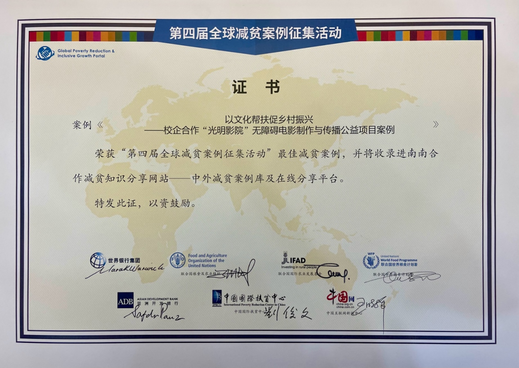 2023年11月1日,“2023 全球减贫伙伴研讨会”在京召开。会上发布了由中国国际扶贫中心、世界银行、联合国粮农组织、国际农业发展基金、联合国世界粮食计划署、亚洲开发银行、中国互联网新闻中心7家机构联合发起的第四届“全球减贫案例征集活动”104个获奖案例名单。中国传媒大学《以文化帮扶促乡村振兴——校企合作“光明影院”无障碍电影制作与传播公益项目案例》从全球898个案例中脱颖而出,荣获“第四届全球减贫案例征集活动”最佳减贫案例,并将收录进南南合作减贫案例库,为促进全球减贫、巩固脱贫成果和推动乡村发展提供特色鲜明的减贫模式与实施方案。