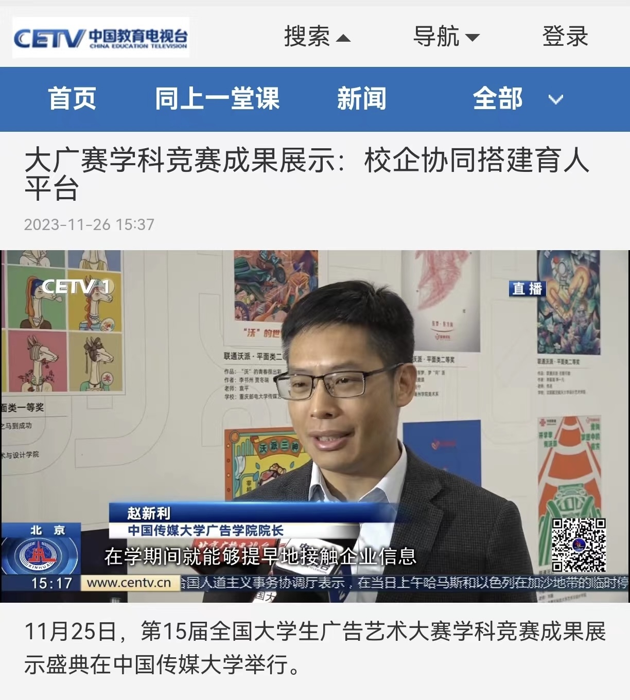 在颁奖典礼上,中国传媒大学广告学院院长赵新利接受了中国教育电视台的采访。他提到“大广赛让学生在学期间就能够提早地接触企业信息,了解企业的需求,能够真题真做,进入到企业各种传播活动当中去,为他们未来的就业,未来进入这个社会打下更好的基础。”