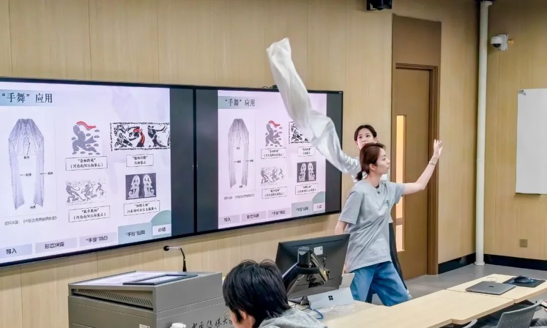 林婷教授的课程“舞蹈鉴赏”采用演示式、探究式、情景式相结合的教学模式,教学重点明确,触及学生心理,同时做到“身形合一”,深受同学们的喜爱。课程内容设定两大主线——何为舞蹈?舞蹈何为?涵盖如何认识不同舞种的形态特征、如何解读不同舞种的审美范式、如何在身心融合的舞动中实现对自身的认知等。为充分发挥学生的主观能动性,引导创新实践教育,林婷鼓励不同专业多元化创作,比如将AI图形生成技术融入舞蹈影像风格化创作,从虚拟制片的角度丰富舞蹈的视觉表达,用广告学的视角分析优秀舞蹈IP的营销策略。