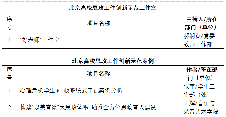 我校推荐申报的“‘好老师’工作室”入选北京高校思政工作创新示范工作室;《心理危机学生家-校系统式干预案例分析》《构建“以美育德”大思政体系 助推全方位思政育人建设》入选北京高校思政工作创新示范案例。