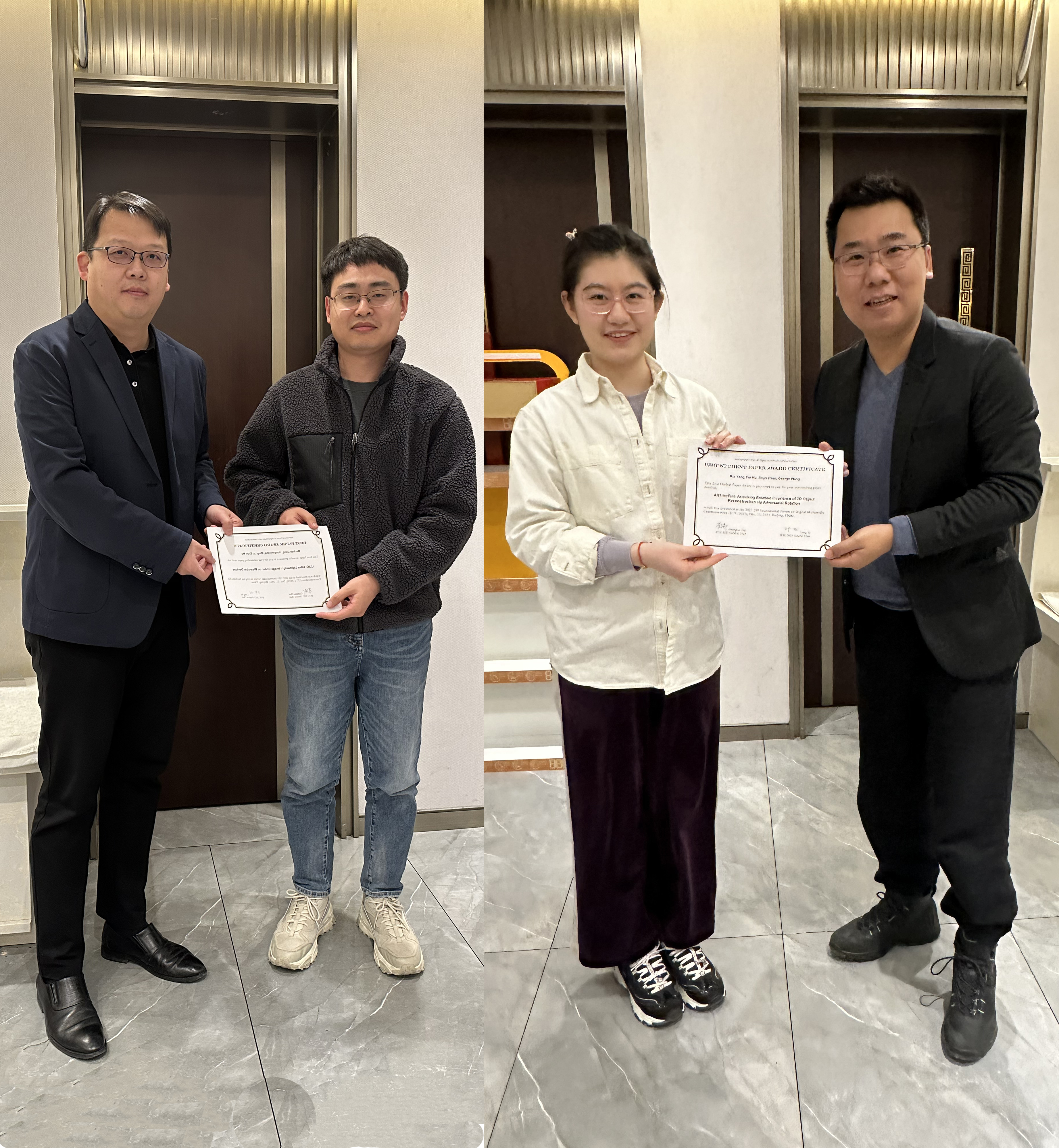 会议录用论文中审稿成绩排名前11位的文章作者受邀进行了口头报告。通过现场评审,南京大学团队的论文“ULIC: Ultra Lightweight Image Coder on Wearable Devices”获评最佳论文,中国传媒大学团队的论文”Acquiring Rotation Invariance of 3D Object Reconstruction via Adversarial Rotation”获评最佳学生论文。中国传媒大学校长助理金炜、上海交通大学教授翟广涛分别为最佳论文与最佳学生论文获得者颁发了获奖证书。