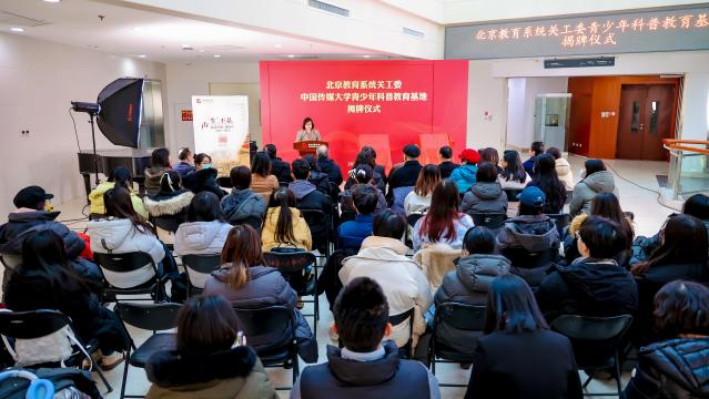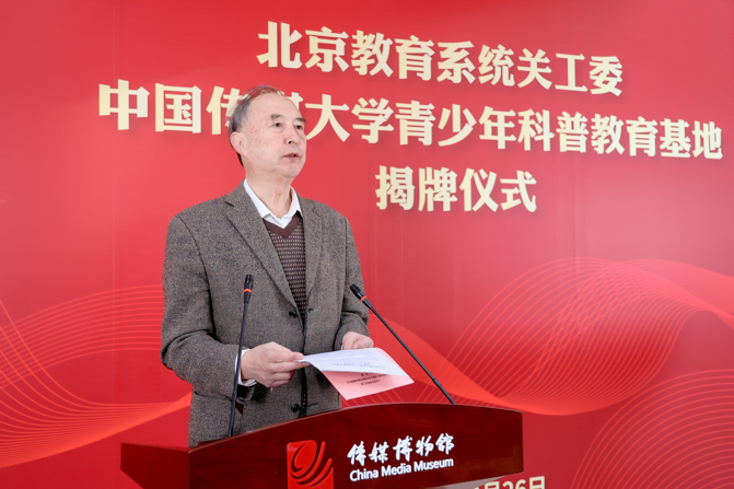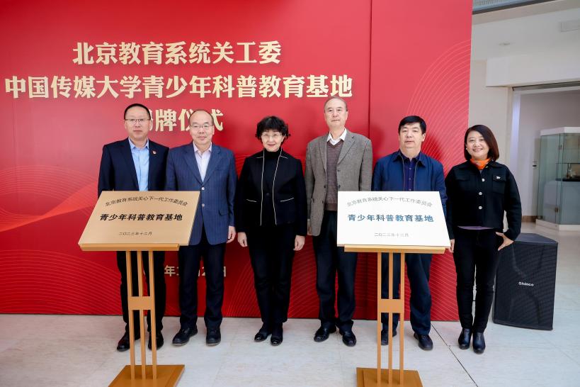 北京教育系统关工委主任张雪、副主任卢思锋,中国传媒大学党委常委、副校长、学校关工委主任刘守训,学校关工委常务副主任、原党委副书记姜绪范,传媒博物馆馆长吴志勇,广告学院党委书记陈江华共同为“中国传媒大学青少年科普教育基地”揭牌。