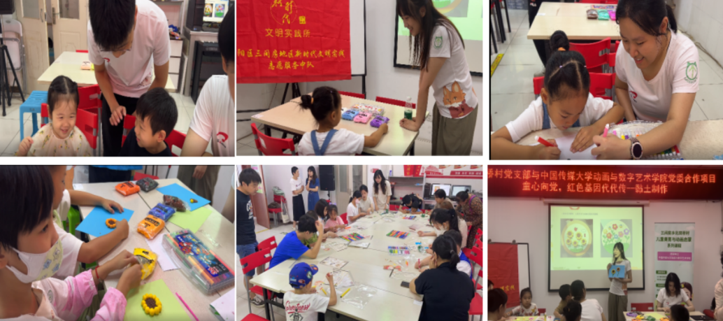 为积极响应北京市教工委关于红色“1+1”活动的号召,中国传媒大学动画与数字艺术学院本科生党支部与三间房乡北双桥村党支部开展了系列共建活动。活动通过动画的形式将美育知识和体验带给当地儿童,并促进他们的创造力、审美能力和文化认同的发展。与此同时,传媒学生也运用专业知识美化街道,提升乡村居民的幸福感。本年度开展共建活动12次(含专题研讨3次、美育课堂5次、文创市集3次、设计主题月1次),形成了2万字的乡村儿童美育教案,完成小红军动画创作、室内红色教育展板设计3幅、室外展板6幅、沉浸式灯光设计作品12组。先后共有30名党员、120名积极分子参与活动,辐射当地居民近2000人次。