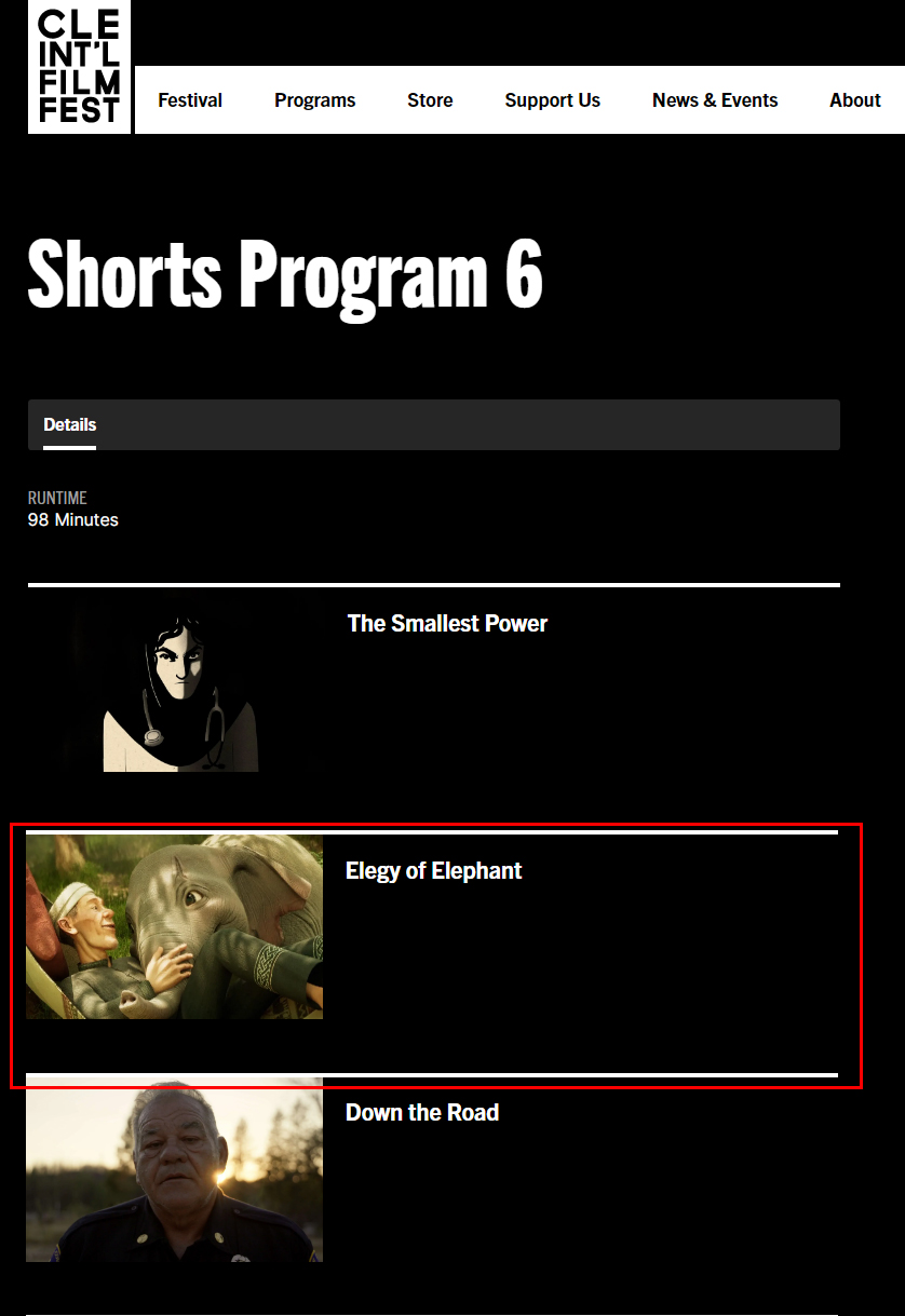 克利夫兰国际电影节创办于1977年,迄今已有48年历史,致力于向世界观众展现电影作为教育、娱乐和生活体验媒介的重要价值,每年都会吸引超过10万名电影爱好者参与其中,是俄亥俄州最大的电影盛事,也是全球少数几个同时具有真人短片、动画短片、纪录短片三个单元奥斯卡奖认证资格的权威节展之一。第48届克利夫兰国际电影节将于2024年4月3日-13日在克利夫兰市中心的普兰赫斯广场举办,届时《象群挽歌》将在现场进行展映并参与最终奖项的角逐。