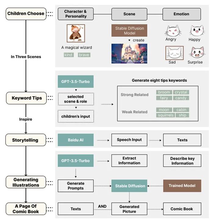 《智绘故事》(StoryPrompt)通过儿童与AI共创故事与绘本的方式,激发儿童的语言表达与创造潜能。在该交互应用中,儿童可以自由选择故事元素,如人物、场景、事件、情绪等,并与AI合作,利用AI实时生成的、与故事密切相关的关键词,激发细节层面的创新火花,进而构建起一套既合逻辑又充满趣味的故事脉络。儿童用户可以通过语音或文字输入的方式来生成故事,并利用训练的模型,将整个故事转化成独一无二的创意绘本。