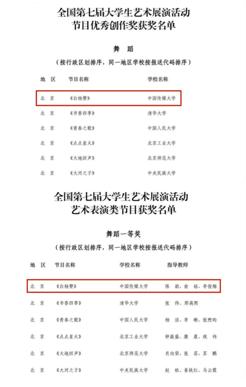 学校舞蹈团参加比赛的原创作品《白杨赞》,以中国民族民间舞蹈语汇构建了“白杨”的形象。作品以树喻人,以小见大,洁白的身姿仿佛在春风中摇曳、在逆风中盘旋,在一次次狂风暴雪的席卷后仍旧以昂扬姿态拥抱世界的温暖。“白杨精神”是正直质朴的坚定,是顽强奋进的执着,是傲骨屹立的不屈,是中华民族薪火相传的精神写照,更是对生命的永恒礼赞。来自全校各专业20名舞蹈团的同学们,首次登上全国比赛的舞台就绽放出耀眼的光芒。