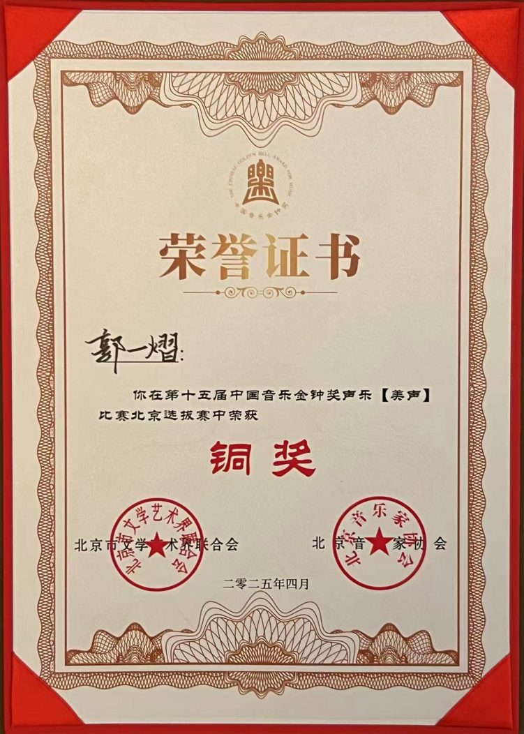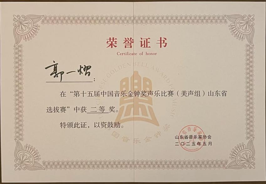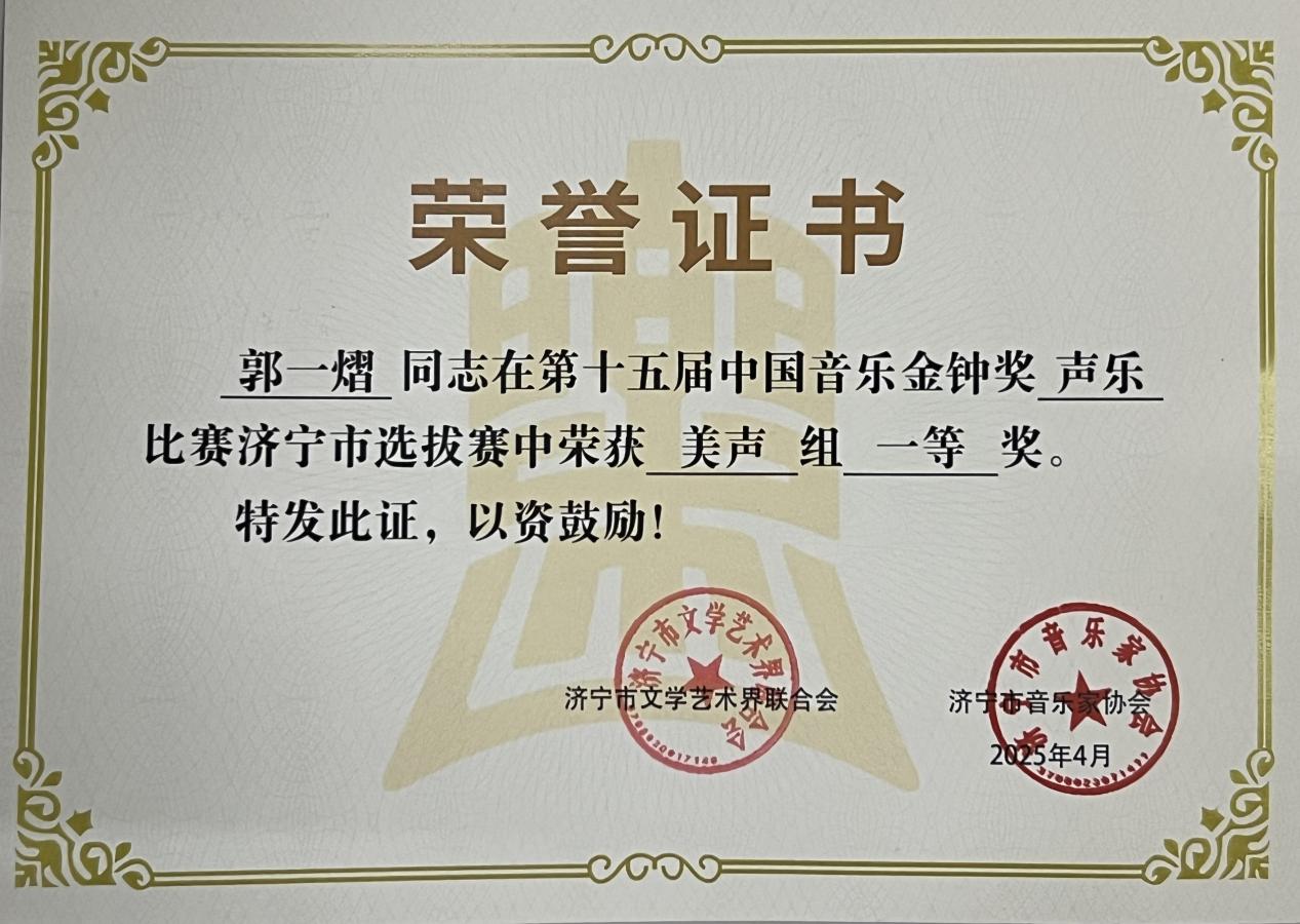 4月12日,济宁赛区选拔赛率先落幕,郭一熠最终以9.957分斩获美声组一等奖。4月17日至18日,北京选拔赛(声乐比赛)于老舍剧场举行,其凭借94.474分位列第十,摘得铜奖。5月6日至7日,山东赛区总决赛在潍坊拉开帷幕,面对全省47名专业选手,郭一熠以9.89分并列第五的成绩荣获二等奖,再创佳绩。