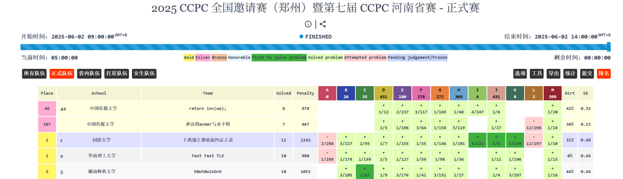 (通讯员 黄玮 杨丽芳 张昕)近日,2025中国大学生程序设计竞赛(China Collegiate Programming Contest,简称CCPC)全国邀请赛(郑州)在黄河科技学院举办。来自武汉大学、同济大学、北京理工大学、中国传媒大学等全国192所高校的438支队伍齐聚中原,展开了一场激烈的算法巅峰对决。中国传媒大学ACM校队在高手如林的赛场上脱颖而出,一举斩获两枚银牌,向全国高校展现了中传学子在算法竞技领域的强劲实力。本次比赛由计算机与网络空间安全学院黄玮副教授和信息与通信工程学院杨丽芳副教授共同指导。
