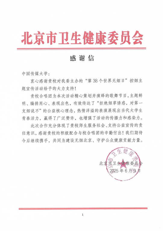 活动圆满落幕后,北京市卫生健康委员会专门发来感谢信,对校合唱团的出色表现和辛勤付出给予了高度评价和诚挚感谢。信中不仅褒奖了学生们的专业素养与奉献精神,也充分肯定了中国传媒大学在此次活动中给予的全力支持。本次演出任务从精心筹备排练到舞台上的完美呈现,每一步都离不开学校各级领导和相关指导教师的悉心指导与倾力支持,对此深表感谢。