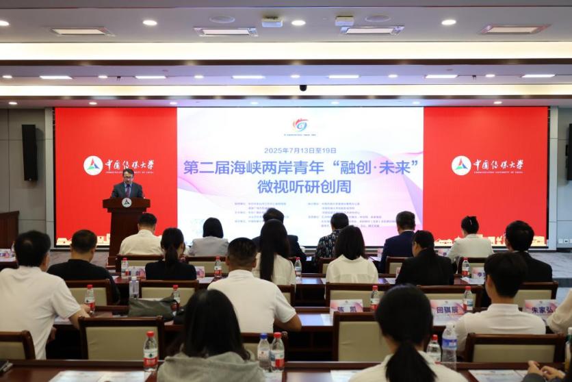 (通讯员 李旷怡 摄影 梁博洋)7月14日上午,在中共中央台湾工作办公室宣传局和国家广电总局港澳台办的指导下,由中华广播影视交流协会与台北市影音节目制作商业同业公会联袂主办,由中国传媒大学承办的第二届海峡两岸青年“融创·未来”微视听研创周活动在中传学术中心拉开帷幕。