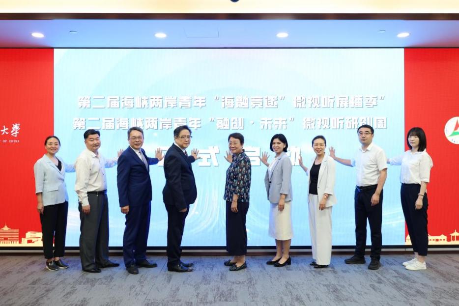 中华广播影视交流协会理事长李秋芳、台北市影音公会理事长陈仲祺、中国传媒大学校长张树庭、中央台办宣传局副局长朱凤莲、广电总局港澳台办副主任燕旎、五洲传播中心副主任崔斌箴、北京市台办副主任张磊、北京市西城区台办主任蒋晓晖、沐和玥兮(北京)文化责任有限公司行政主管王晓然共同启动了第二届海峡两岸青年“海融竞逐”微视听展播季和第二届海峡两岸青年“融创•未来”微视听研创周。