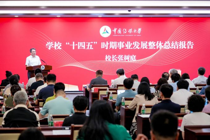 张树庭校长代表学校作“十四五” 时期事业发展整体总结报告。报告指出,“十四五”时期是学校发展史上升级腾飞、步入高质量发展阶段,具有里程碑意义的五年。五年来,学校沿着第三次党代会确定的目标路线,不断用“奋进之笔”书写“得意之作”,“中国特色世界一流传媒大学”的奋斗目标深入人心,“三个跨越”的战略任务扎实推进。