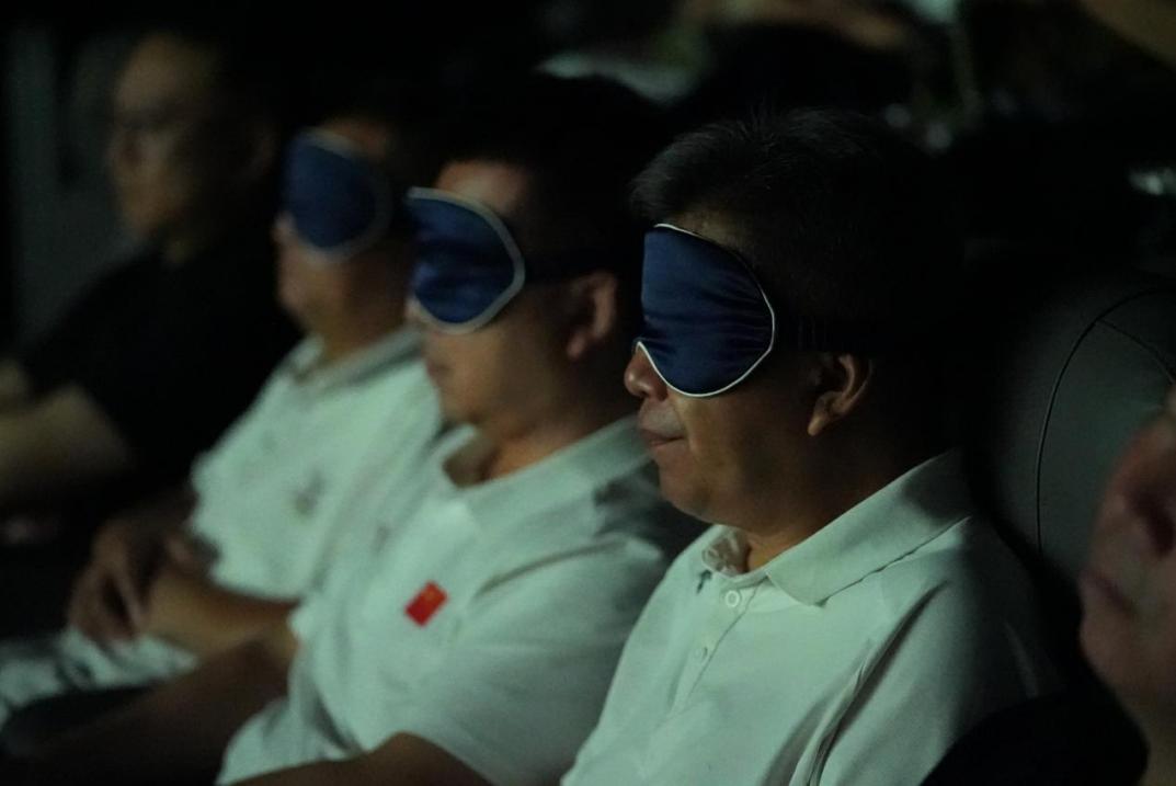 参会代表借助眼罩观看无障碍电影《我的父亲焦裕禄》