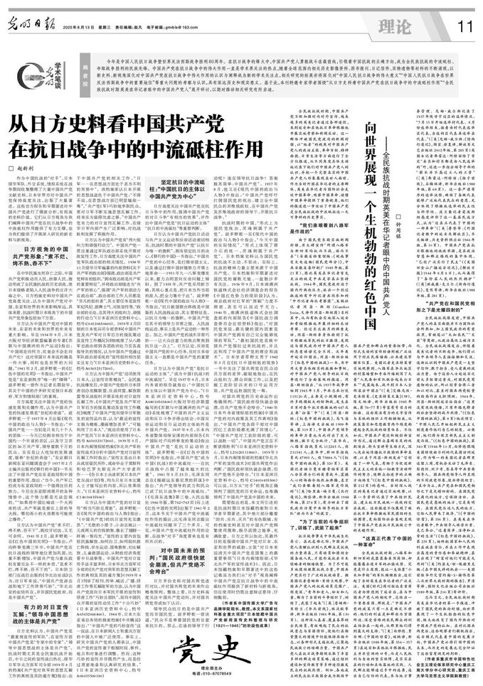 8月13日,《光明日报》理论版刊发项目成果,基于抗战时期日本馆藏档案和日本学者早期著述对中国共产党的缜密分析,从“对手”视角阐释中国共产党在抗日战争中的中流砥柱作用。文章从新史料、新视角深化对“中国人民抗日战争的伟大意义”“中国人民抗日战争在世界反法西斯战争中的重要地位”等重大问题的考察与认识,具有深远历史和现实意义。