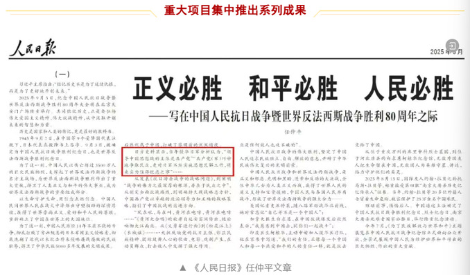 9月2日,《人民日报》发表任仲平文章《正义必胜 和平必胜 人民必胜——写在中国人民抗日战争暨世界反法西斯战争胜利80周年之际》,文章在第二部分引用了我校重大项目成果:日方史料显示,当年侵华日军分析认为,“领导中国思想战的主体是共产党”“共产党(军)巧妙地争取民众,更对日军不断实施思想瓦解工作,将来实为值得忧虑之事”······