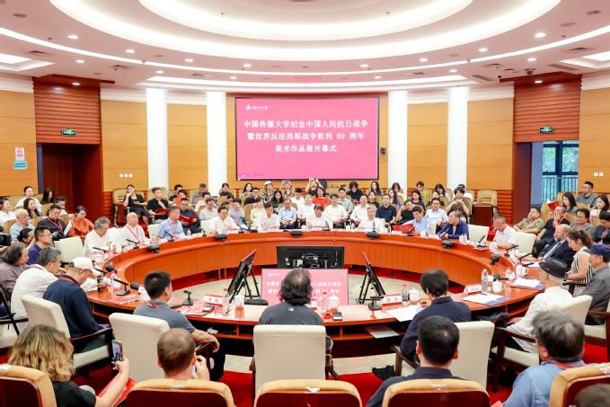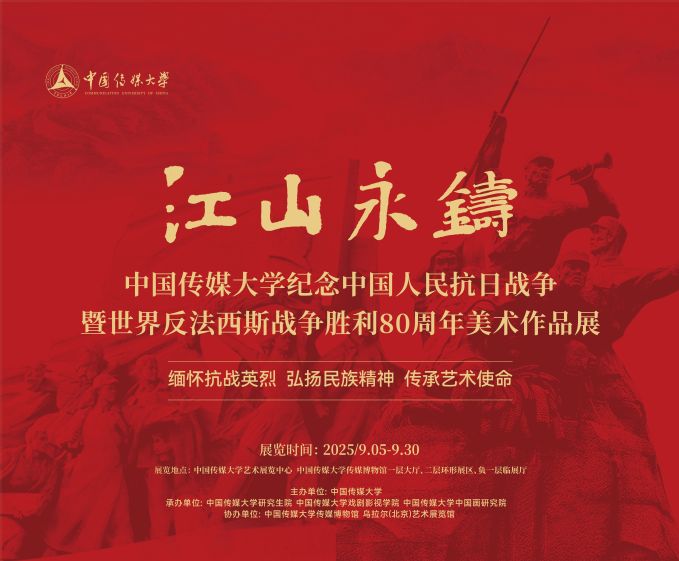 9月5日,中国传媒大学隆重举行“江山永铸——缅怀抗战英烈、弘扬民族精神、传承艺术使命”纪念中国人民抗日战争暨世界反法西斯战争胜利80周年美术作品展开幕式与座谈会。此次展览共展出作品124幅,其中包括中国画博士班100名博士生创作的100幅中国画作品以及俄罗斯艺术家们创作的24幅油画作品。展览通过主题性艺术创作,深切缅怀为民族独立与世界和平英勇献身的抗战英烈,铭记伟大历史,弘扬以爱国主义为核心的民族精神,展现新时代艺术教育工作者传承红色基因、赓续历史文脉的使命担当。