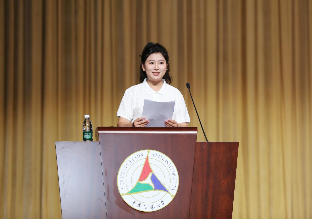 国际预科学生会主席苏洢琳作为学员代表发言。她结合自身经历,分享了“从迷茫到笃定”的成长历程,表示预科阶段是多元文化交融和人格独立发展的重要阶段,系统的课程、丰富的活动,可以真实触摸到传媒的脉搏,为海外学习打下坚实基础。她提醒学弟学妹,积极参与校园活动,主动利用学校资源,拓展视野、结识挚友,从中传出发,向世界报到。
