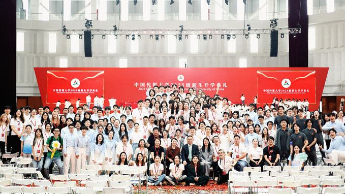开学典礼设置了北京校区主会场和海南校区分会场,实现两校区线上联动。主会场新生座位区域的红色舞台形状既像展开的书页,也似一张寄往未来崭新的信笺,祝福同学们开启“好好做个读书人”的求索新程。
