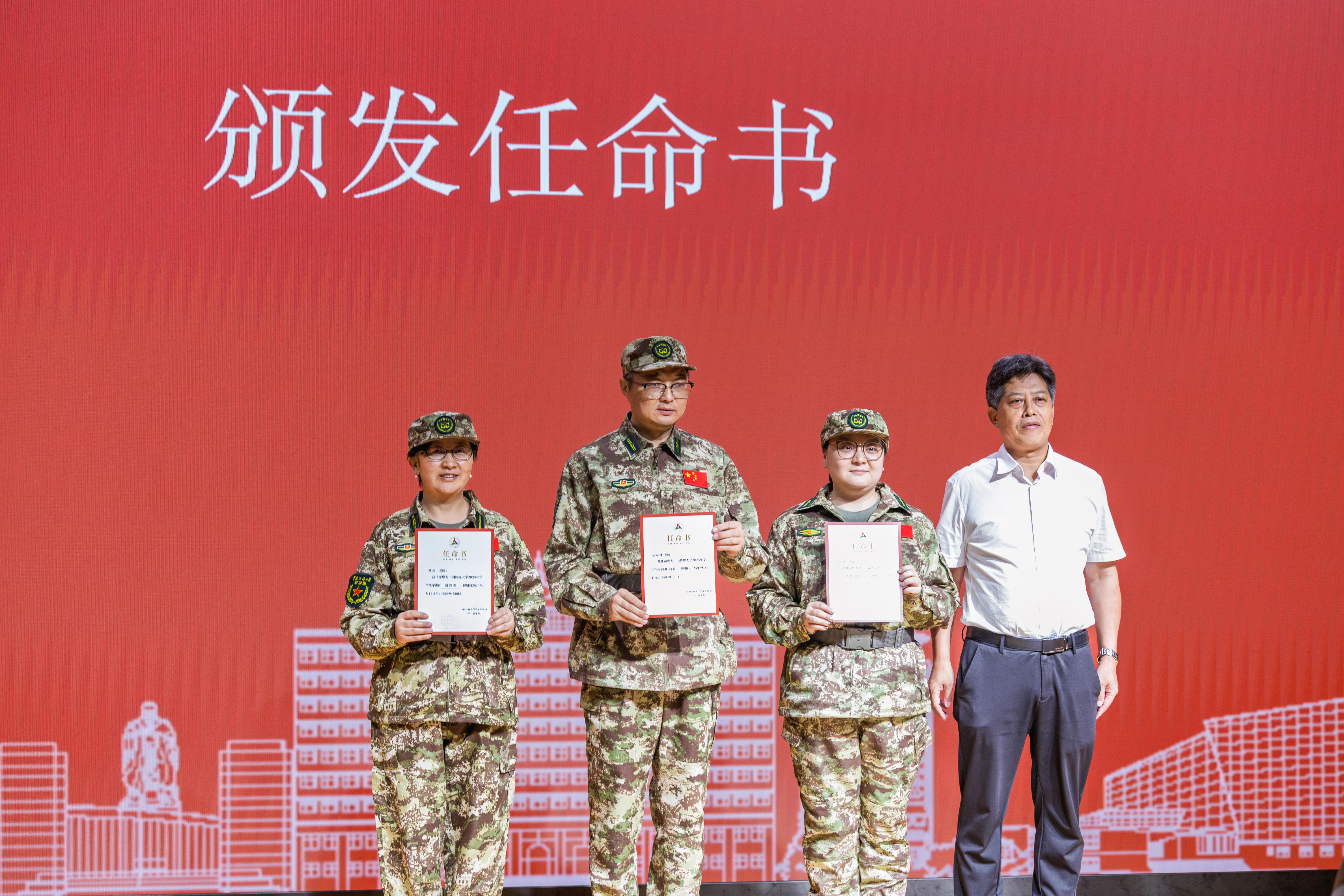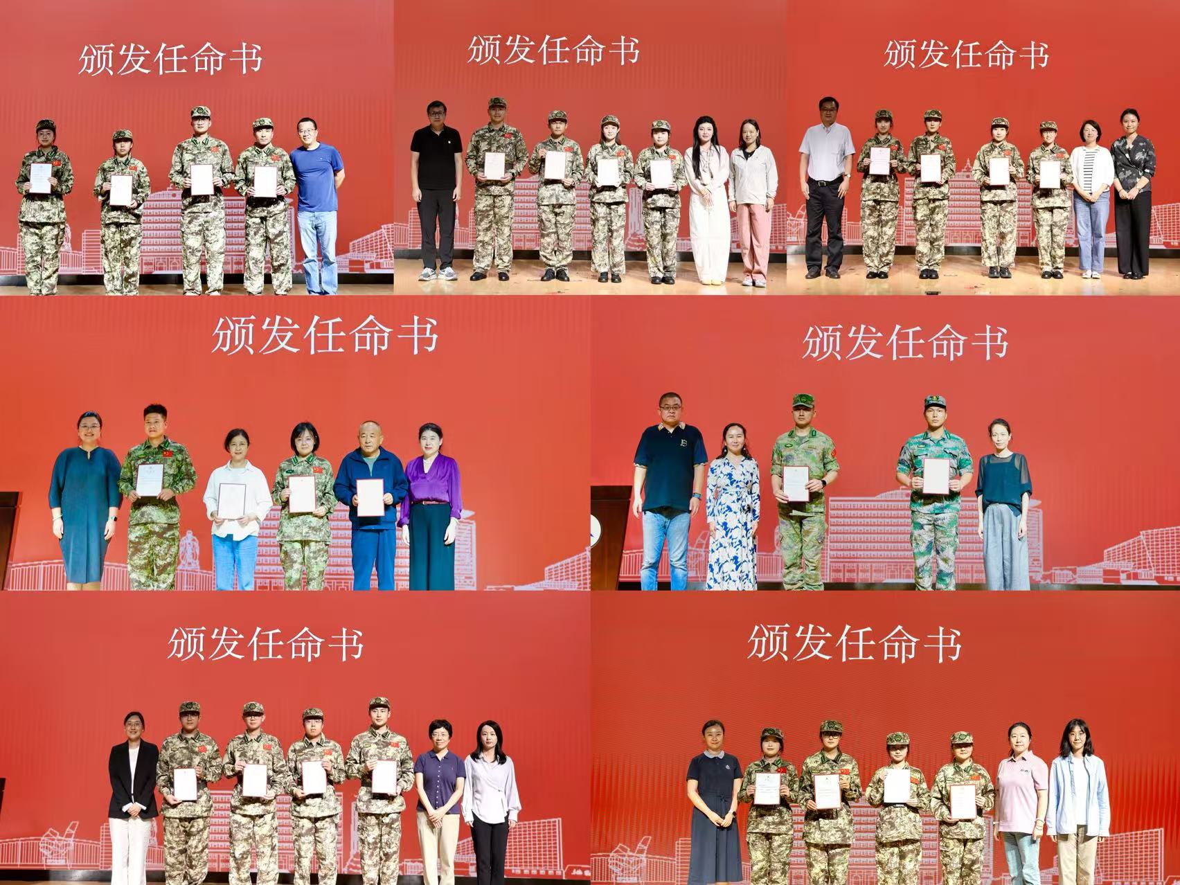 相关职能部门领导为干事代表、军医代表、参谋代表颁发任命书,学院主管学生工作副书记为各连指导员颁发任命书。