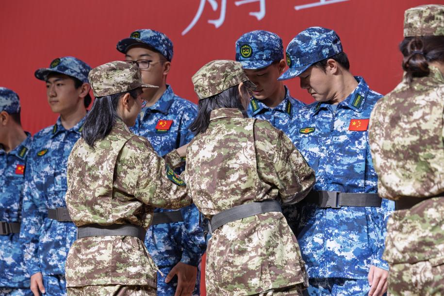 各连副指导员为各学院参训学生代表佩戴臂章。