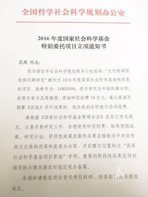 日前,经全国哲学社会科学规划领导小组办公室批准,由我校文化发展研究院范周教授作为首席专家开展的“文化领域供给侧问题研究”被列为2016年度国家社会科学基金特别委托项目(批准号为:16@ZH006,资助研究经费为30万元)。这是继“《公共文化服务保障法》立法研究及草案起草”项目(批准号:2014@J058)之后,文化...