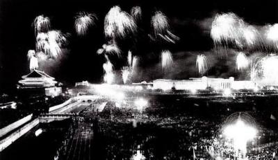 国庆节那一天晚上,有150多万群众在天安门广场尽情歌舞狂欢。毛泽东、刘少奇、朱德、周恩来等党和国家领导人,在天安门城楼上观看广场上群众大联欢和五彩缤纷的节日焰火。我们一直在金水桥畔的广场上,和清华大学、北京大学等大学生们一起跳舞,一直到晚上12点,才依依不舍的开始离开天安门广场,沿西长安大街慢慢步行走回学校。
