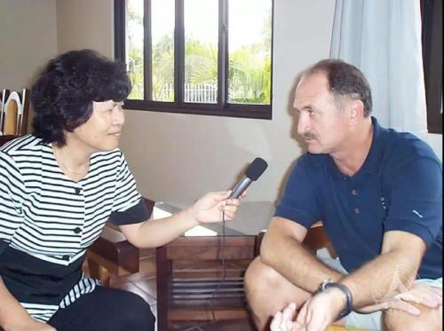 2002年的世界杯中国队跟巴西队有一场比赛,当时巴西队主教练练斯科拉里的新闻官在里约热内卢举行的记者吹风会上,喻老师提出希望采访斯科拉里。“希望特别渺茫,当时他是世界关注的人物。后来有天突然一个电话,说斯科拉里答应采访,但是明天下午2点在他Porto Alegre的家里。”当时已是下午4点了,喻老师赶快收拾行李去买机票,飞到巴西南部的愉港(PORTO ALEGRE),在斯科拉里家里做了一次十分成功的采访。