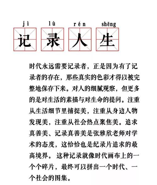她说纪录片是一个太有趣的东西,它可以帮人屏蔽掉很多浮躁的东西,给人提供一个让人持续坚持下去的一种能量。她坚持人不能追随浮躁社会里最热闹、最繁华的东西,人不能失去自我。她选择纪录片,并用纪录片追求真善美。