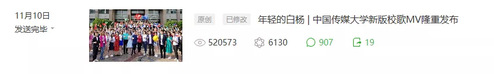 “新版校歌MV发布”微信单条推文阅读量突破50万,微博话题#中国传媒大学65周年校庆#参与度接近1900万,新版宣传片微信推送单条阅读量接近3万,《中国教育报》头版头条大篇幅报道学校,新华社、中央人民广播电台、中...