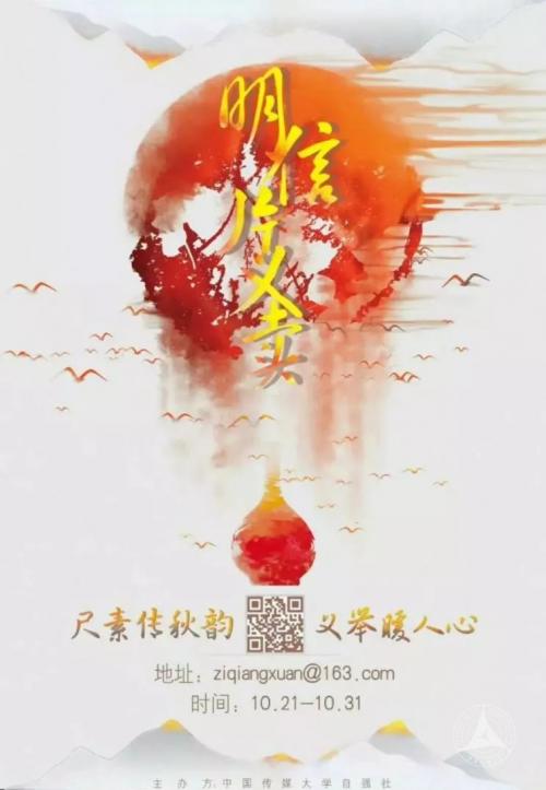 活动时间:10月29日——11月4日 活动地点:中国传媒大学 发布者:许诺、刘晨辉 活动 【CUC自强人】明信片照片征集 活动时间:10.21-10.31期间 简介:把你手中含有广院美丽风景的照片发给我们,由我...