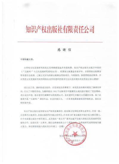 (通讯员 田卉)近日,知识产权出版社给我校文化发展研究院发来感谢信,感谢文化发展研究院范周教授及其团队为《“互联网”+与文化发展研究系列丛书》项目付出的辛勤劳动。经国家出版基金专家评审,并报国家出版基...