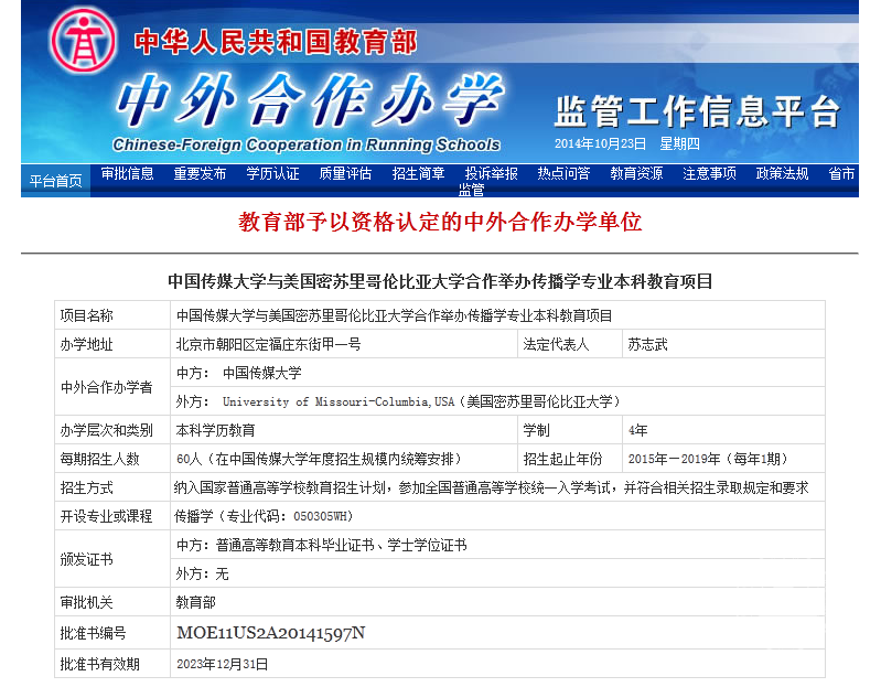 “中传-密苏里传播学”中外合作办学本科学位喜获教育部批准