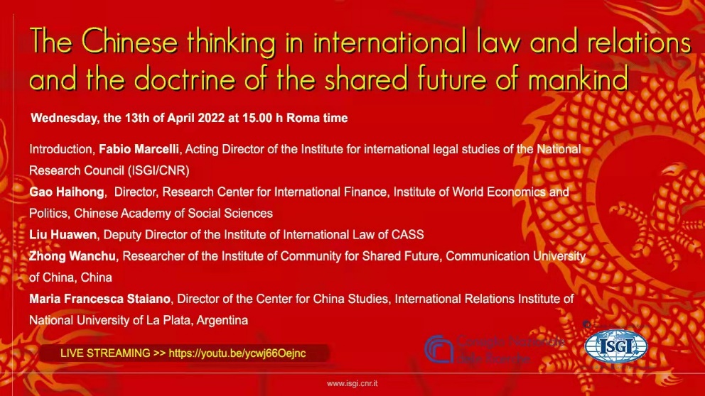 (通讯员 钟婉初)4月13日,由意大利国家研究理事会法律研究中心主办的第二届“国际法与国际关系视域下的中国思维及人类命运共同体理念”主题研讨会在线上举行,会议由中心负责人法比奥·马切利主持,中国社科院国际...