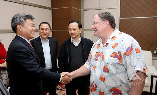 讲座前,廖祥忠副校长与约翰·拉塞特先生就今后双方合作进行了会谈。廖副校长介绍了我校动画教育开展情况以及承担教育部全国高校动画、数字媒体专业教指委的工作开展情况。约翰·拉塞特先生表示,华特迪士尼公司和皮克斯工作室将定期派遣动画艺术家来中国传媒大学讲学,并邀请我校师生赴美访问。他希望以教指委和中国传媒大学为桥梁,积极支持中国动画教育事业的未来发展,推动实现中美动画产业的共赢局面。
