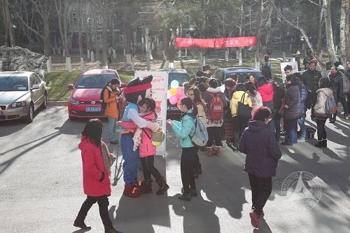 活动现场,伴随着欢快的圣诞歌,活动人员还会向同学们赠送近期的校报。此外,“抱抱君”更是成为现场一道亮丽的风景!校报微信主页君“抱抱君”平时可是神龙见首不见尾。平日只能在微信上等待“抱抱君”推送的同学们,这次终于可以看见真人版的“抱抱君”啦!这次活动里“抱抱君”可谓是使劲浑身解数,招呼各位前来的小伙伴,在现场卖萌耍宝欢乐不断,人气爆棚,很多同学参加完评选活动,为自己心目中的十大新闻投上一票后,除了领礼物外还要做的一件事就是和萌萌的抱抱君求合照。更有一些“忠实粉丝”是专门为和抱抱君合照来的哦!