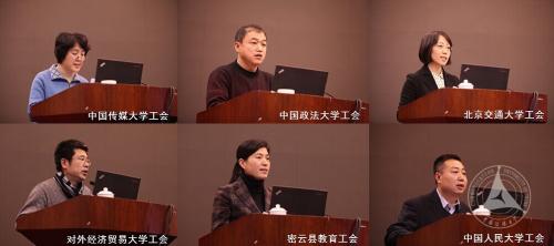 会上,中国教科文卫体工会全国委员会主席万明东,北京市总工会党组成员、副主席张青山出席会议并讲话,北京市教育工会主席史利国全面总结了2014年市教育工会工作,提出了2015年工作的总体要求和主要任务。北京市教育工会常务副主席刘欢主持会议。中国传媒大学工会、中国政法大学工会、北京交通大学工会、对外经济贸易大学工会、密云县教育工会和中国人民大学工会现场进行了工作经验交流发言。我校工会常务副主席赵怡以《践行依法治校,构建和谐劳动关系》为题,作了我校探索开展非在编职工工会工作的发言,得到了在场领导和很多高校工会同仁的肯定和赞扬。
